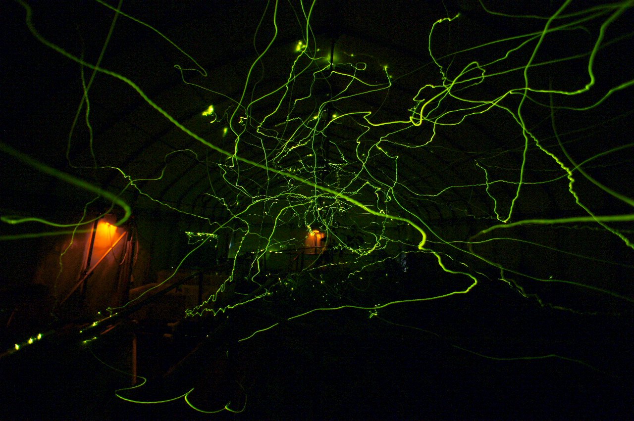 庭の水路にいた蛍幼虫が、上陸してそれが庭で乱舞している状況です。