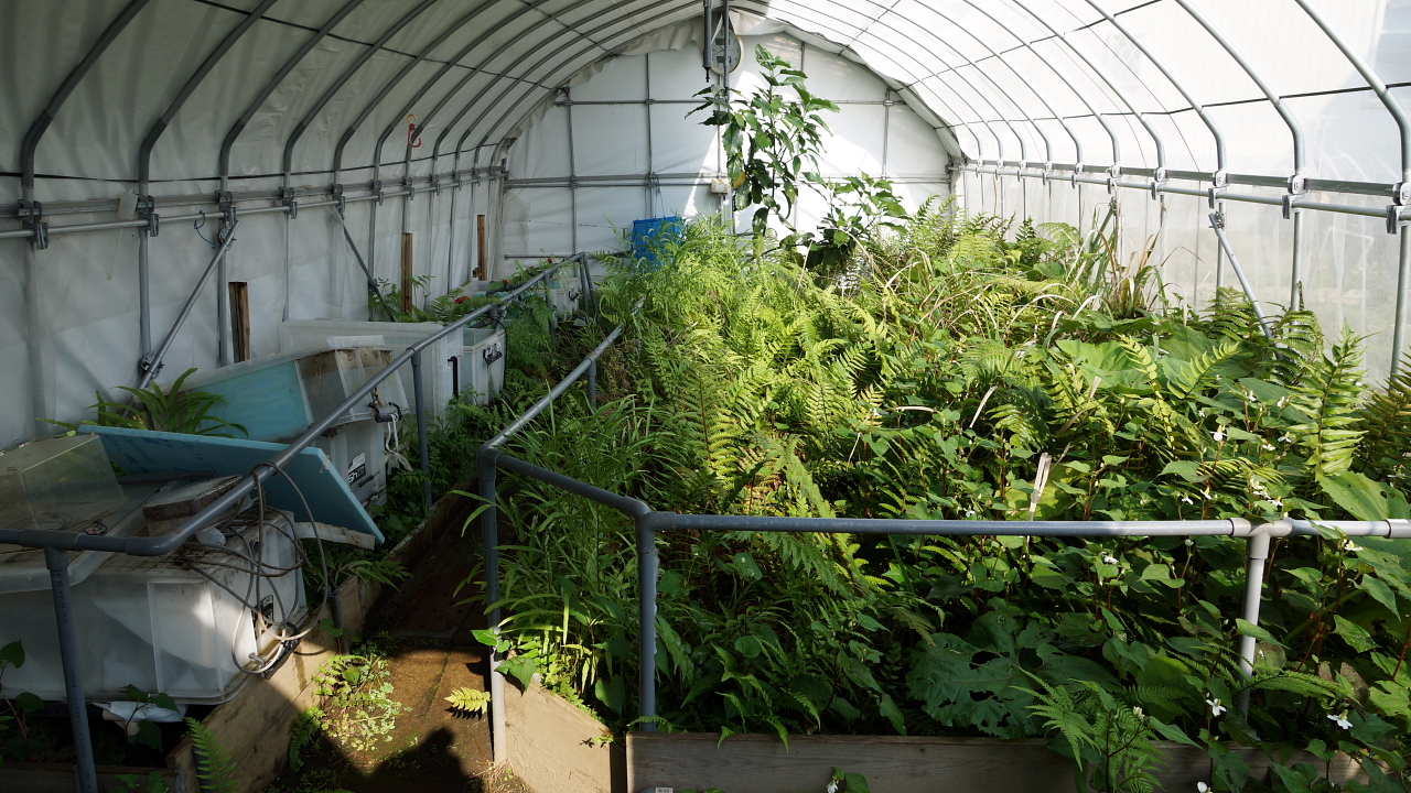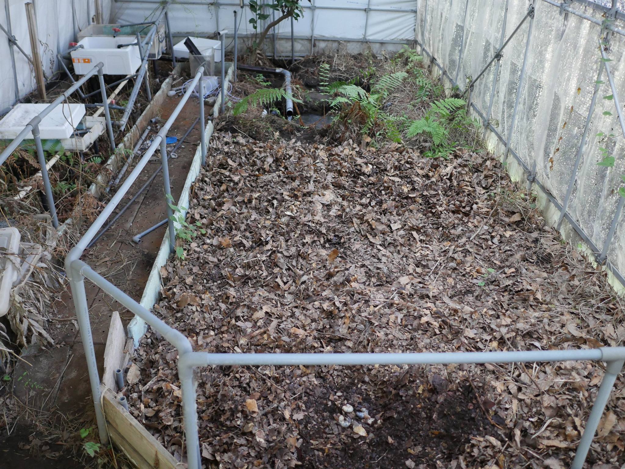 室内で始めた飼育は、現在屋外でビニールハウス内に井戸水をかけ流して飼育しています。