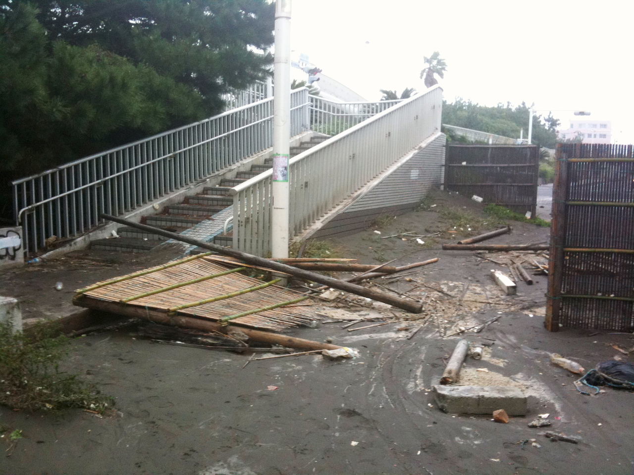 砂の飛散を防止する柵が流されたり、壊れたり修理にかなりの時間がかかりそうです。