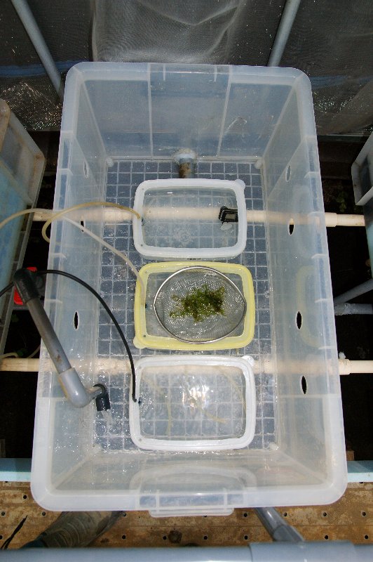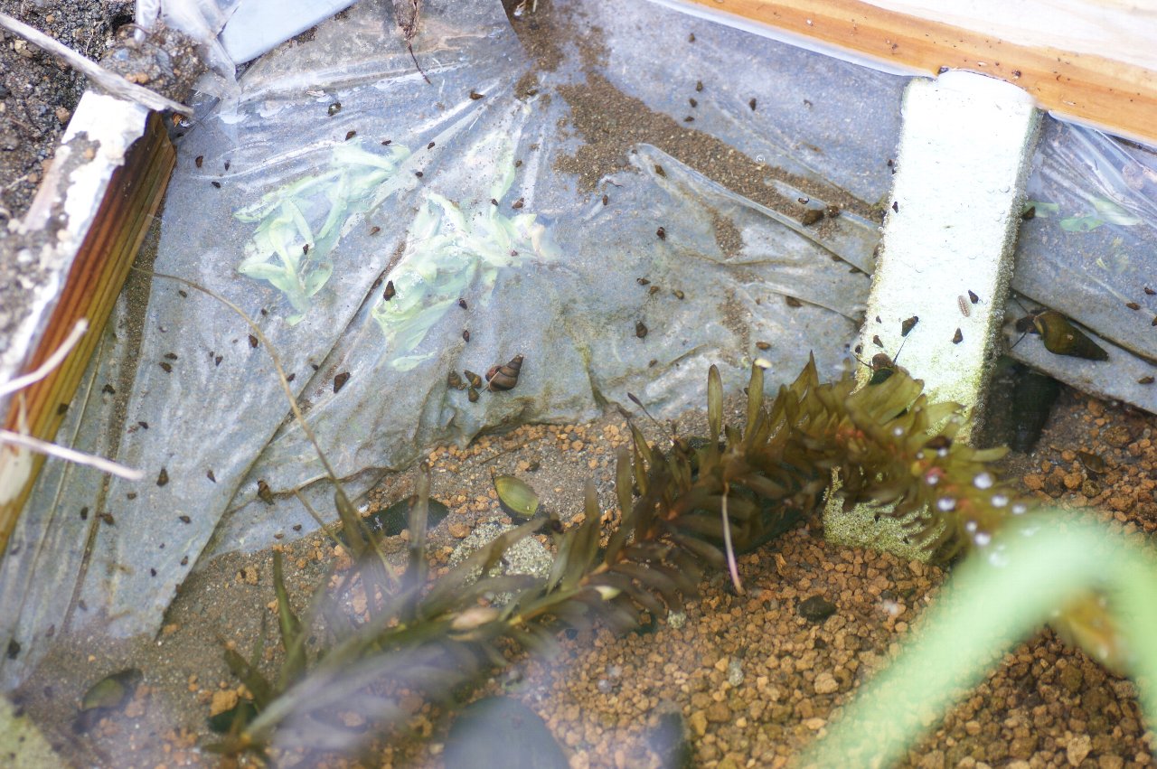 室内で始めた飼育は、現在屋外でビニールハウス内に井戸水をかけ流して飼育しています。