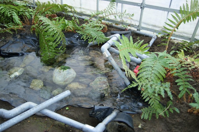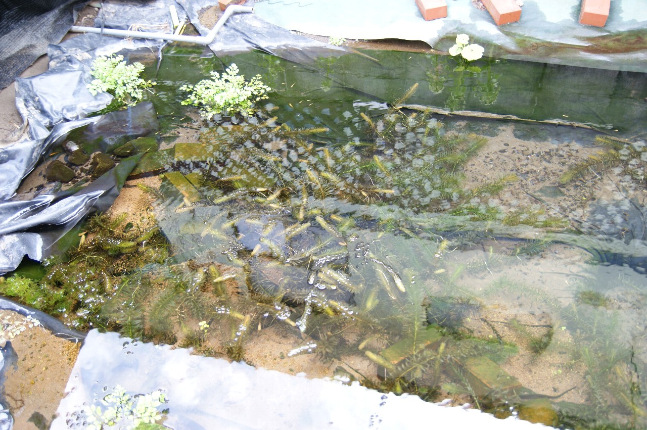 ハウス内から流れた井戸水は池へ流れますが、流れ込みは一番暖かいので