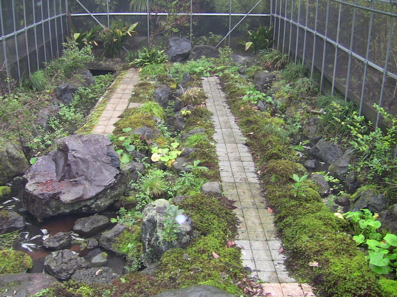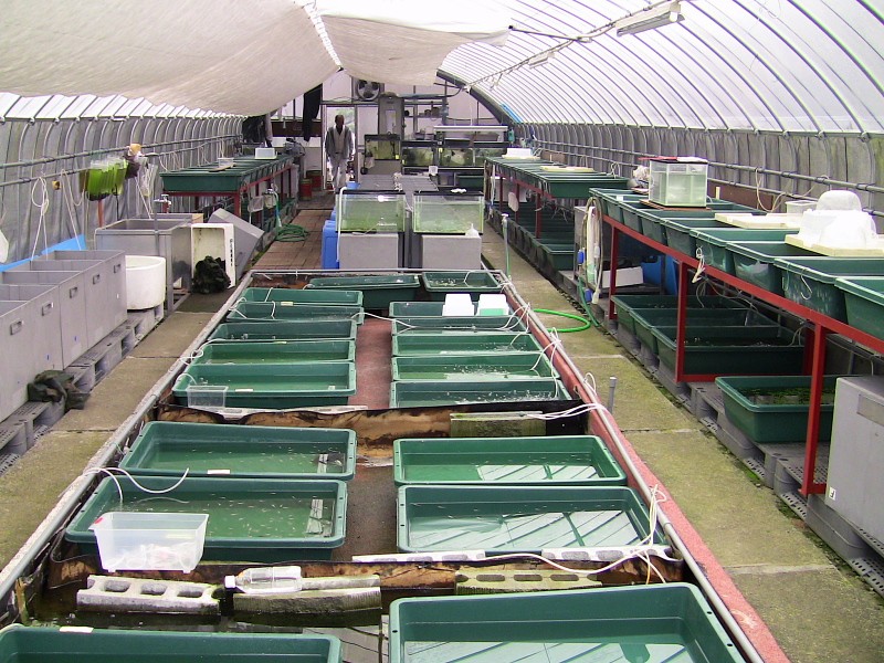 室内で始めた飼育は、現在屋外でビニールハウス内に井戸水をかけ流して飼育しています。