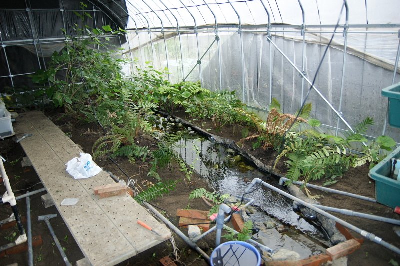 室内で始めた飼育は、現在屋外でビニールハウス内に井戸水をかけ流して飼育しています。
