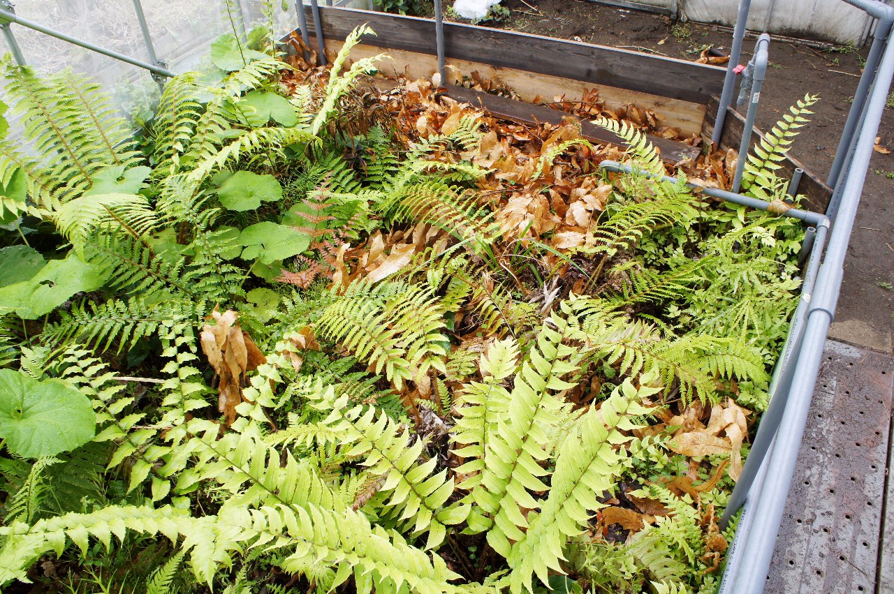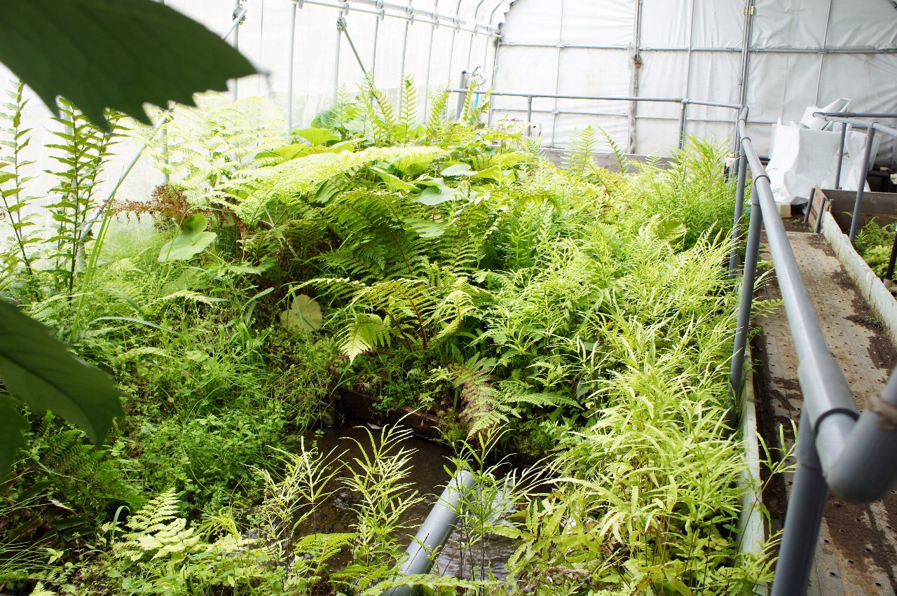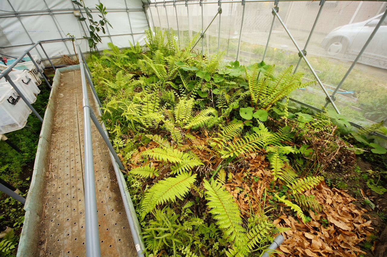 ハウスはシダが生い茂り、今年はネットなのでハウス内の気温が下がり