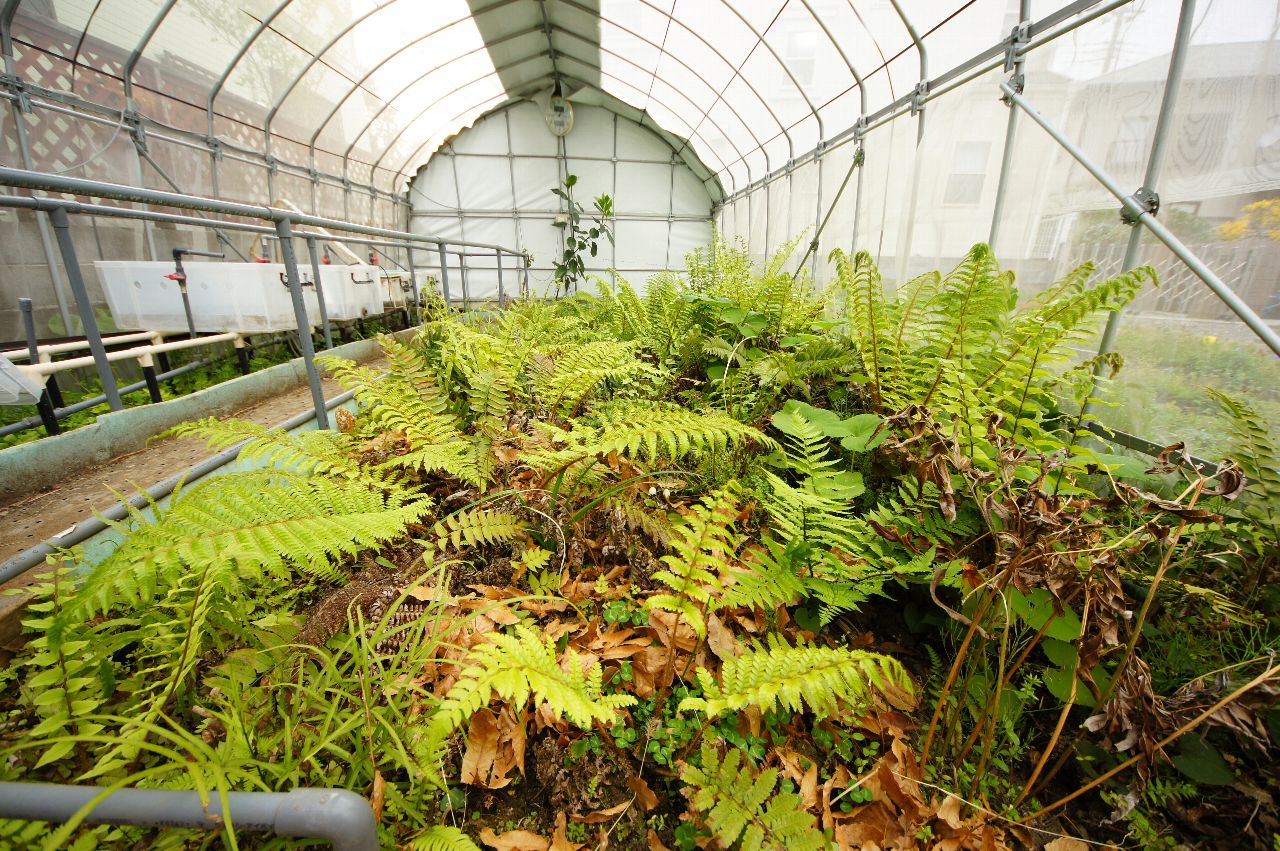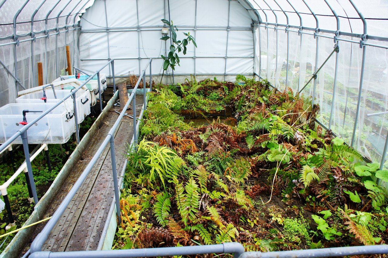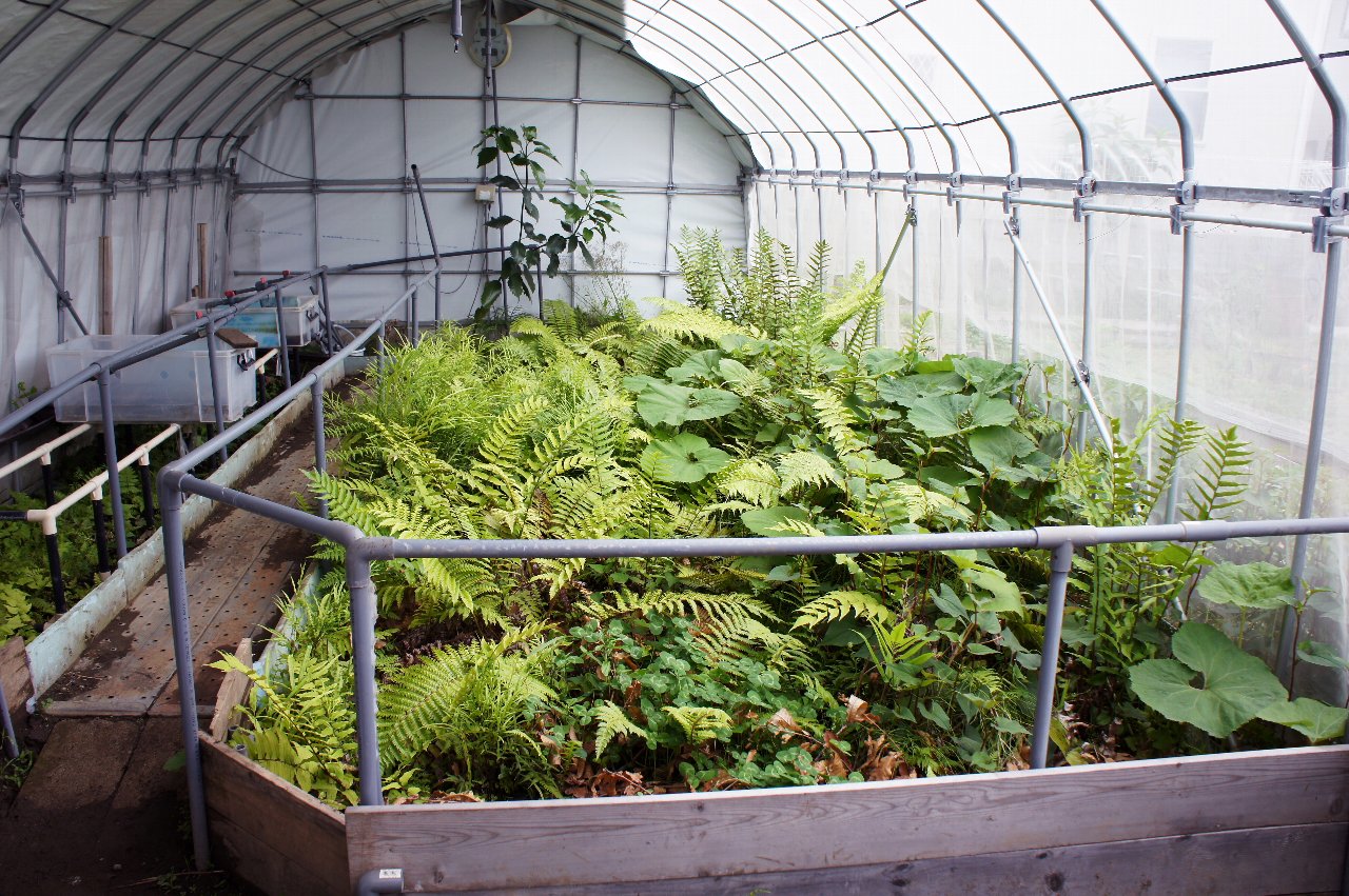 ハウスはシダが生い茂り、今年はネットなのでハウス内の気温が下がり