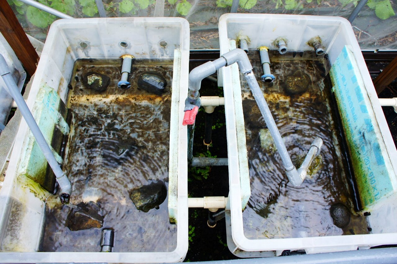 室内で始めた飼育は、現在屋外でビニールハウス内に井戸水をかけ流して飼育しています。