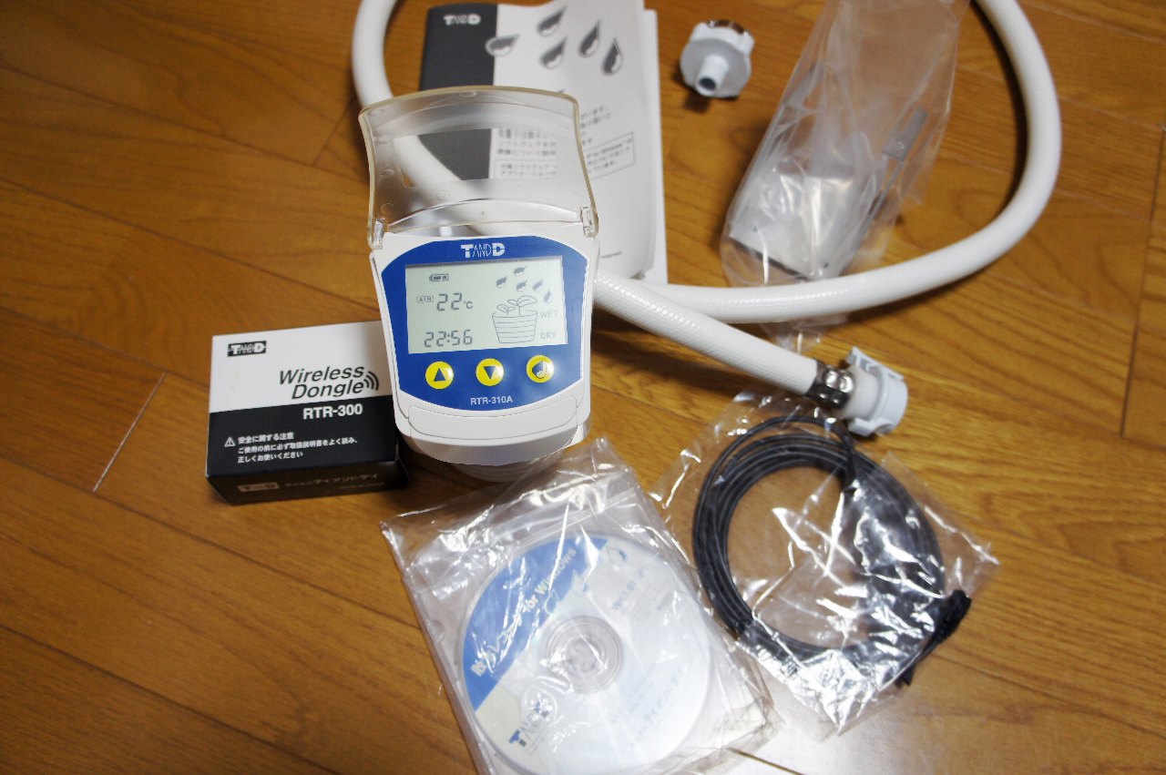 「散水レコーダ」はプランター、花壇、庭などの土の水分、土の温度、気温を自動的に記録し、無線によって離れた場所にあるパソコンに記録データを送信することができます。