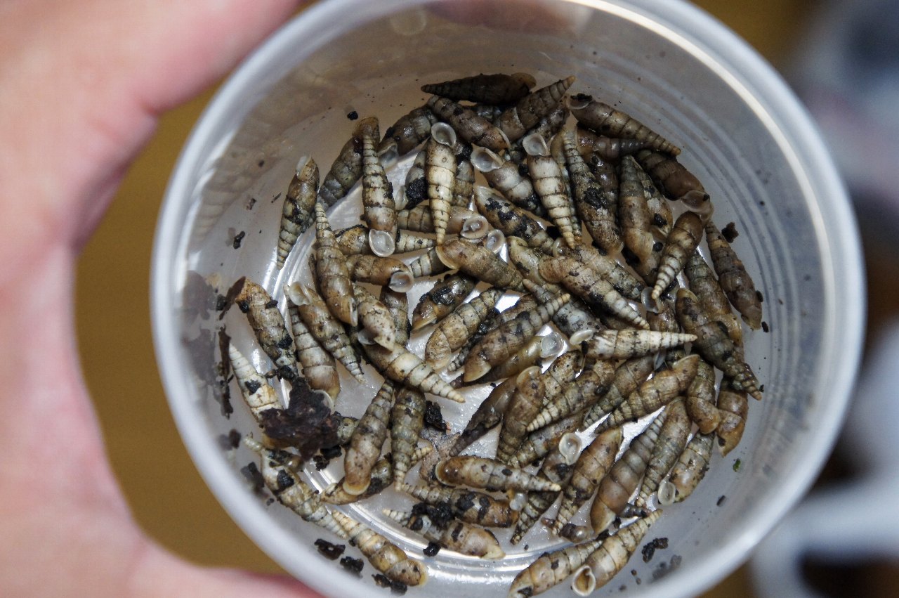フキに群がっているカワニナ。