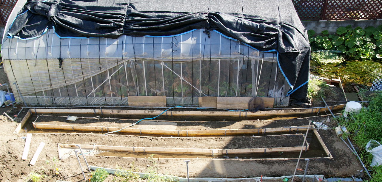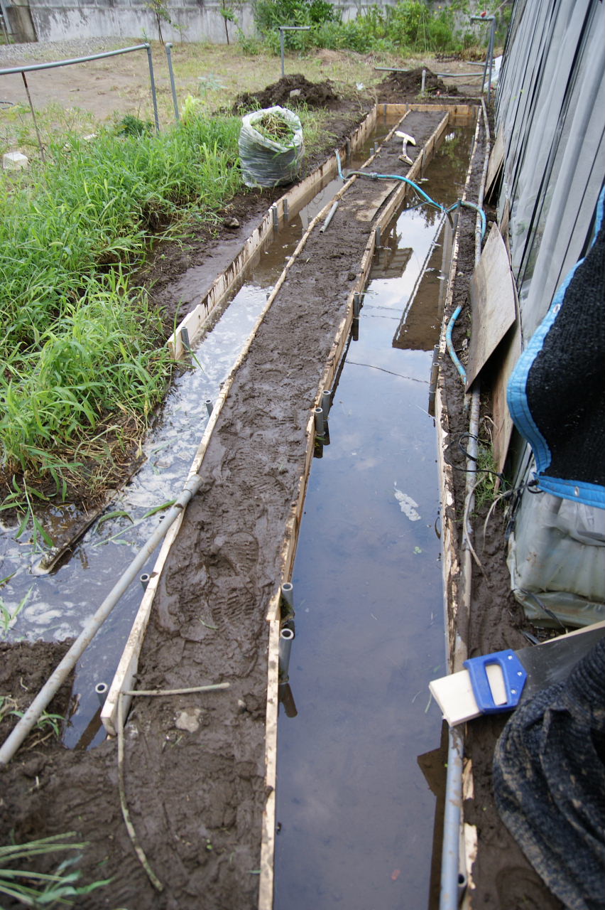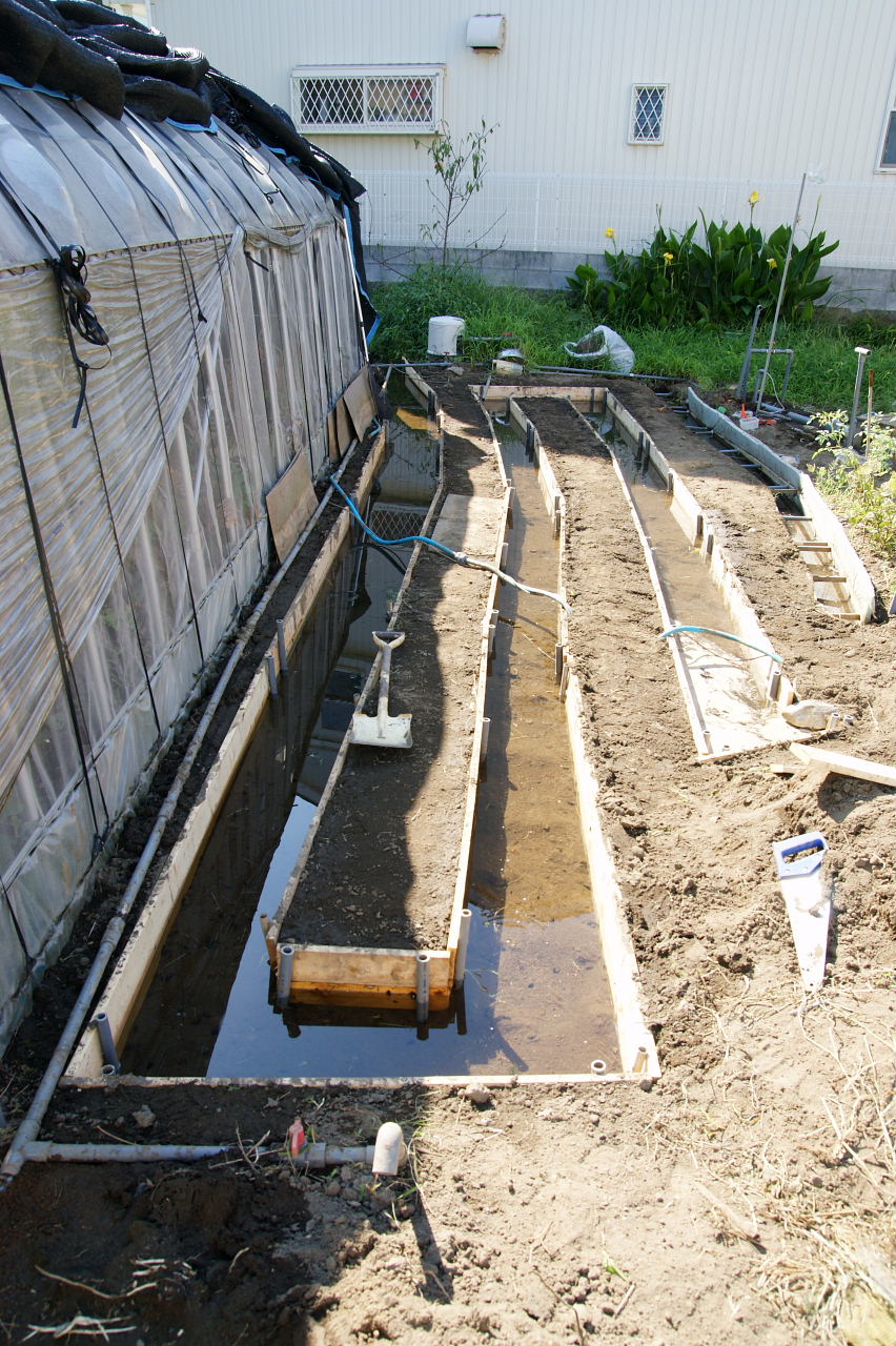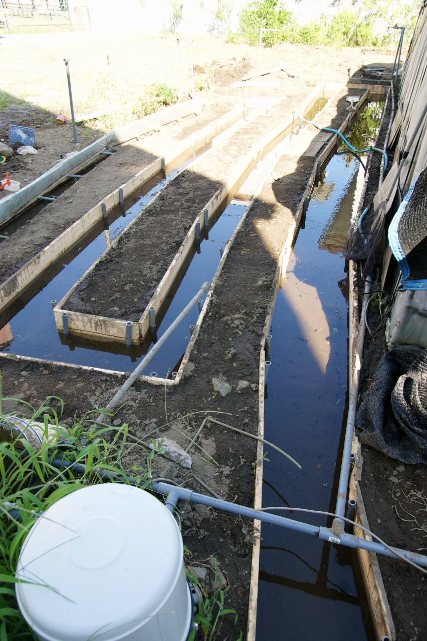 室内で始めた飼育は、現在屋外でビニールハウス内に井戸水をかけ流して飼育しています。
